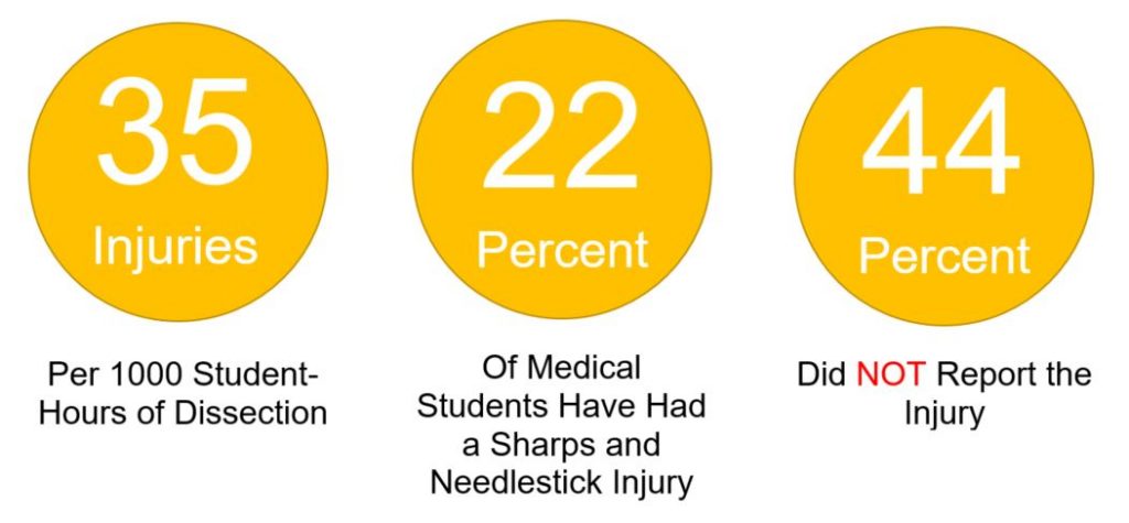 According to a recent study conducted at the University of St Andrews Scotland UK over a 5-year period, for every 1000 hours of scalpel usage in a dissecting laboratory there were 35 injuries.3 Over a fifth of the medical student population have had a sharps or needlestick injury. And more worryingly, nearly half of the students did not report the incident.