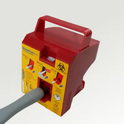 The Qlicksmart BladeFlask EVO has been designed to comply with the international standard colours for medical sharps waste. The red unit complies with US, Central America, and South America standards, and the yellow unit complies with most other countries’ standards. Please consult your organization to determine which unit complies with local standard colours for medical sharps waste.