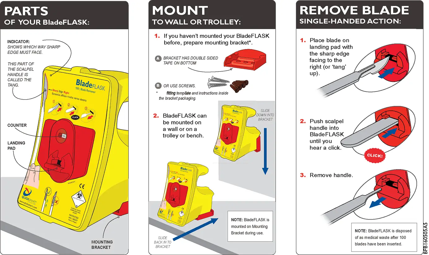 BladeFLASK is simple to use with a quick “push, click, and pull” action to remove and contain used scalpel blades.