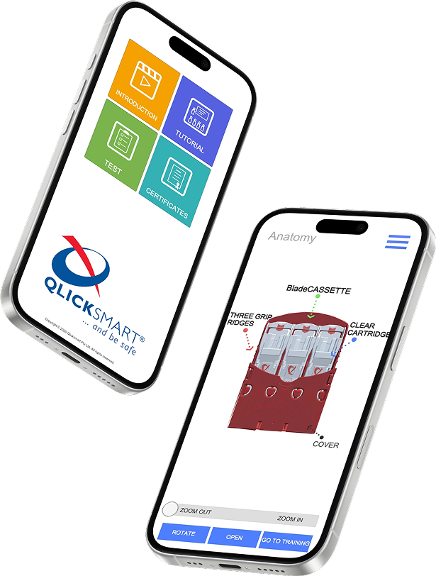 The Qlicksmart Interactive Training App includes interactive 3D renderings of the famous BladeCASSETTE scalpel blade remover as well as a step-by-step training module on how to use it. Users will get a chance to try out their knowledge in the testing section and will be able to generate a certificate once they pass – proof that they are able to remove scalpel blades safely.
