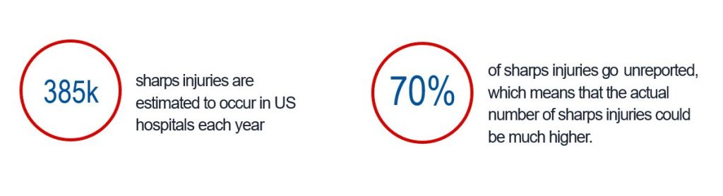 It is estimated that in US Hospitals, 385,000 sharps injuries occur each year (2) with 70% of those injured go unreported (3).