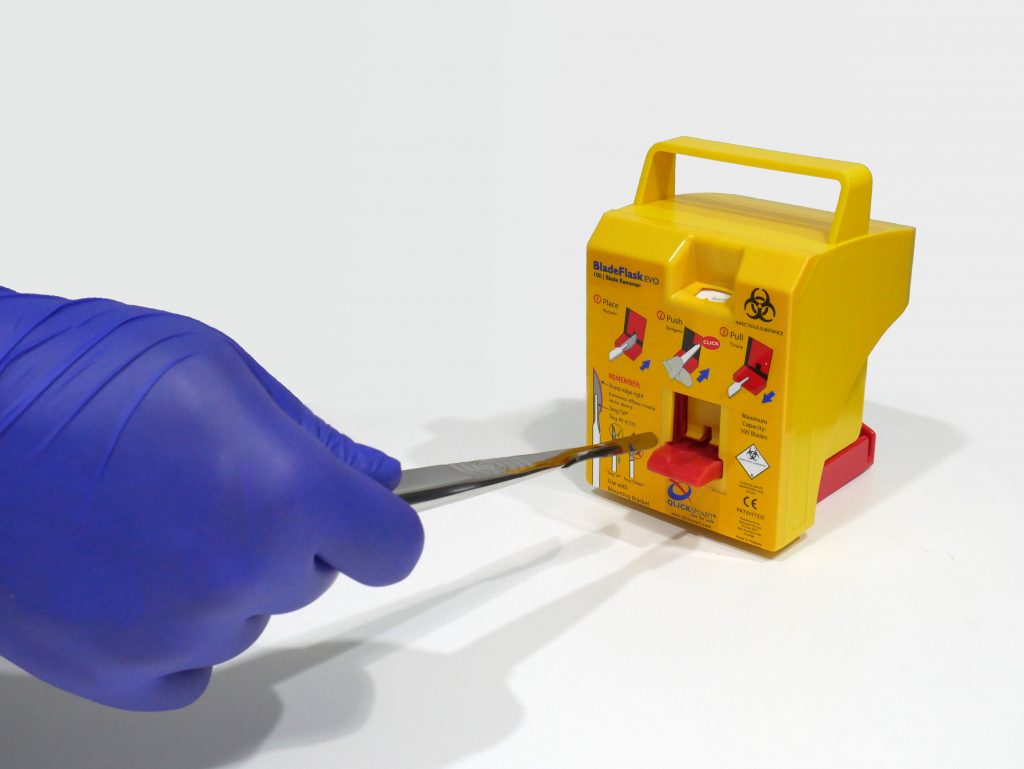 Another Qlicksmart device is the multi-use BladeFlask EVO Scalpel Blade Remover. The non-sterile scalpel blade remover helps with safe and easy scalpel blade removal and containment. It’s classified as a sharps container, and removes 100 scalpel blades.