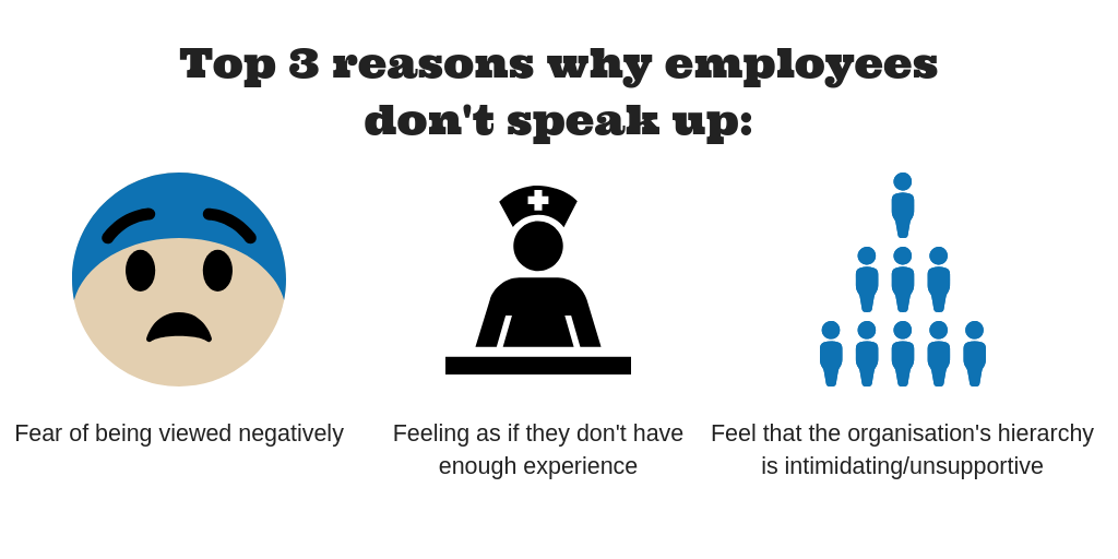 Whether an individual speaks up or not is influenced by a number of factors; personal (such as age or personality), organisational (such as position in hierarchy), and contextual (such as the organisation’s policies and safety culture). It is suggested that the contextual factors are the primary motive for employees staying silent. In a qualitative study undertaken in the US, the top three reasons that employees didn’t speak up about their concerns or problems were out of fear of being viewed negatively, feeling as if they did not have enough experience or tenure to speak up, and considering their organization to have an intimidating hierarchical structure and/or an unsupportive climate.