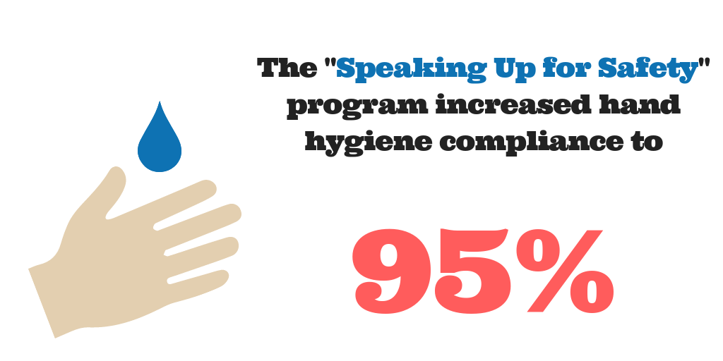 Following these steps, a “Speaking Up For Safety” program was implemented across the hospital. The program became the ultimate error prevention tool as it trained staff on how to speak up to those who weren’t complying with hand hygiene practices, and set up a chain of command for reporting if resistance was found. The staff were given a “script” for how to discuss hand hygiene with their colleagues; “ask, request, concern”.