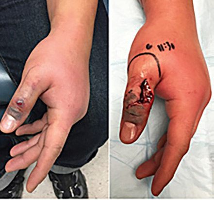 He was a healthy non-smoker, on no medications. In the ED he was afebrile and a 5mm laceration was noted with a distal haemorrhagic blister. There was no pain and ROM was full.