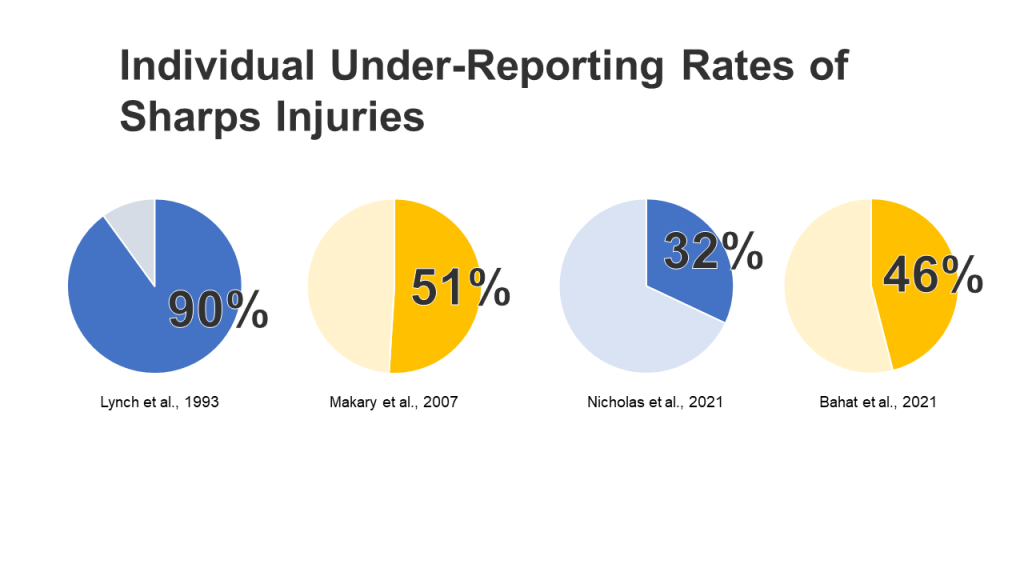 Looking specifically at under-reporting for sharps injuries, we’ve had to put up international statistics, as there is currently no routine national surveillance of sharps injuries in Canada. Researchers in Canada have noted that this lack of national data has made it difficult to both identify the risks to healthcare workers, and the impact of safety interventions if and when they are introduced.