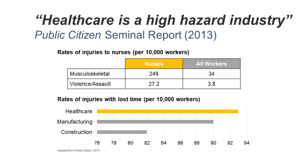 In 2013, the Public Citizen, a not-for-profit organization, published its seminal report, in which they concluded that healthcare is a high-hazard workplace.